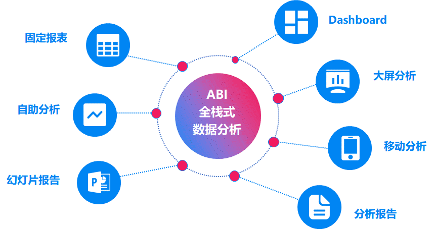 多終端無(wú)縫應(yīng)用,不同移動(dòng)設(shè)備自適應(yīng),一表三屏;在線(xiàn)離線(xiàn)兩種瀏覽模式,脫機(jī)也能隨時(shí)隨地訪(fǎng)問(wèn)移動(dòng)數(shù)據(jù);多種集成、接口技術(shù),可靈活將移動(dòng)分析表、移動(dòng)填報(bào)表集成到第三方app中。 輕松應(yīng)對(duì)各類(lèi)人員分析需求 全角色 有了ABI一站式數(shù)據(jù)分析平臺(tái),可謂是一個(gè)平臺(tái)搞定所有人的需求。既可以為實(shí)施人員提供面向數(shù)據(jù)倉(cāng)庫(kù)的數(shù)據(jù)分析展現(xiàn),也可以為業(yè)務(wù)人員提供自助式數(shù)據(jù)分析能力,還可以讓開(kāi)發(fā)人員靈活實(shí)現(xiàn)個(gè)性化功能擴(kuò)展。 對(duì)于開(kāi)發(fā)人員來(lái)說(shuō),ABI有上千個(gè)API接口,可以靈活實(shí)現(xiàn)個(gè)性化功能擴(kuò)展,縮短項(xiàng)目實(shí)施周期,降低成本。 對(duì)于實(shí)施人員來(lái)說(shuō),技術(shù)門(mén)檻低,可以零腳本制作報(bào)表。 對(duì)于數(shù)倉(cāng)人員來(lái)說(shuō),無(wú)需編寫(xiě)sql,圖形化界面快速完成數(shù)倉(cāng)建設(shè)。 對(duì)于管理人員來(lái)說(shuō),需要充分了解公司運(yùn)營(yíng)概況,通過(guò)KPI報(bào)表可以隨時(shí)隨地獲取企業(yè)關(guān)鍵數(shù)據(jù)信息,真正做到了然于心、謀定而動(dòng)。 對(duì)于業(yè)務(wù)人員來(lái)說(shuō),可通過(guò)自助分析完成求證式、猜想式分析以及圖表分析,發(fā)現(xiàn)數(shù)據(jù)價(jià)值。 對(duì)于運(yùn)維人員來(lái)說(shuō),可視化維護(hù)系統(tǒng)穩(wěn)定,提升工作效果。   不負(fù)眾望,一站式數(shù)據(jù)分析平臺(tái)ABI交互體驗(yàn)更棒,視覺(jué)呈現(xiàn)更炫,快來(lái)和我們一起見(jiàn)證ABI的成長(zhǎng)!