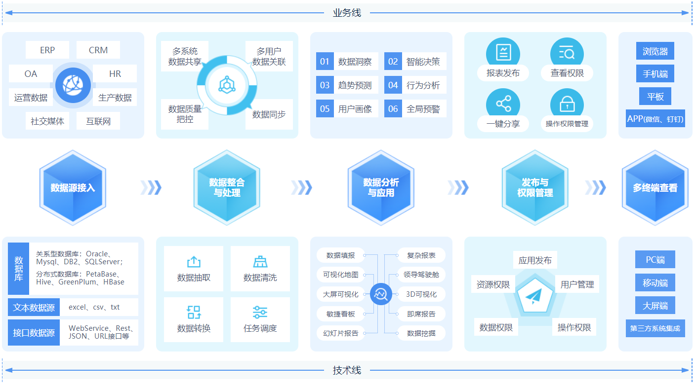 ABI(ALL in one BI)是億信華辰深耕商業(yè)智能領域十多年,在豐富的數據分析挖掘、報表應用等經驗基礎上,自主研發(fā)的一款融合了ETL數據處理、數據建模、指標管理、數據可視化、數據分析、數據填報、移動應用等核心功能而打造的全能型數據分析平臺。