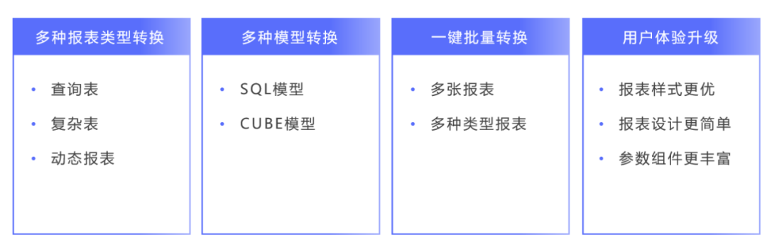 億信ABI覆蓋Cognos轉(zhuǎn)換各種場景,包括各類報表(查詢表、復(fù)雜表、動態(tài)報表等)、模型(SQL模型、CUBE模型、模型表等)的轉(zhuǎn)換都能完美適配,提供批量轉(zhuǎn)換功能,大大提高轉(zhuǎn)換效率。
