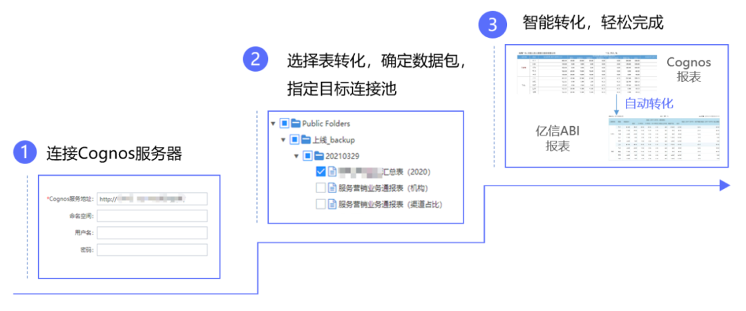 為解決重復(fù)做表與建模問題,通過億信華辰獨家技術(shù)實現(xiàn)Cognos報表的批量轉(zhuǎn)換、自動轉(zhuǎn)換,只需三步完成Cognos報表到億信ABI報表的轉(zhuǎn)換,全程只需幾分鐘。