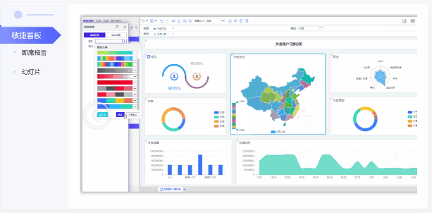 支持敏捷看板,即席報告,幻燈片等多種分析方式,使數(shù)據(jù)分析更貼近用戶應用的場景。并且提供多種可視化組件:表格、常規(guī)統(tǒng)計圖、html5統(tǒng)計圖、地圖等。
