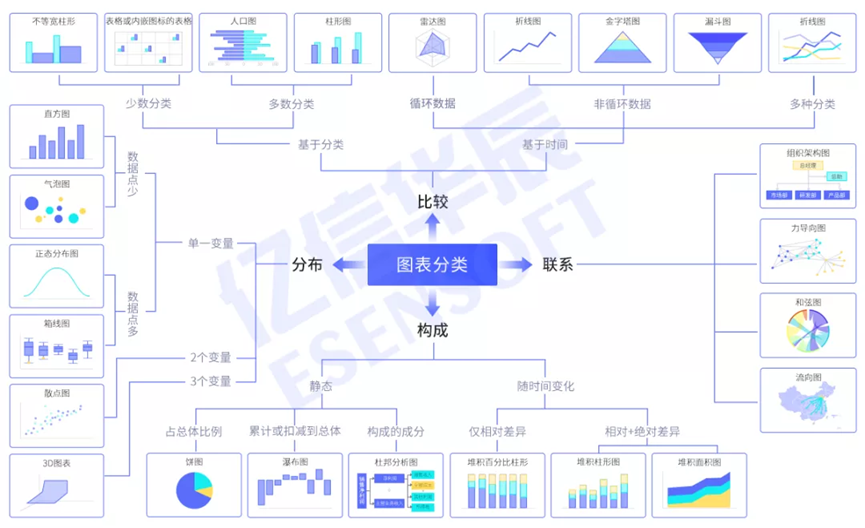 俗話說:“一圖勝千言”,在圖表中我們不僅僅可以看到全國產品銷量的折線圖,還有比較類的柱狀圖。這么多的數據和信息濃縮在一個圖表中,帶給人直觀和多元的感受,但其實這像這樣數據轉化為圖表的過程有一個更好聽的名字叫做——數據可視化。 那么究竟什么是數據可視化呢?就是簡單地理解為Excel圖表嗎? 其實并不是。長久以來,數據可視化都是一個強有力的工具,被業界廣泛使用,簡單地說就是用圖形的方式展現數據。數據可視化和數據分析從來都是離不開的,就像統計學家John Tukey說的那樣“一張圖片的最大價值在于,它迫使我們注意到我們從未期望看到的東西”,一語道破數據可視化的必要性。那么數據可視化一定要通過Excel才能實現嗎,還有什么其他的工具嗎?精美好看的可視化表格是什么樣的,又有什么特點呢? 今天小億和大家從可視化圖表開始,聊聊這些。 一、數據可視化的內涵 1、什么是數據可視化? 數據可視化起源于18世紀。William Playfair在其出版的書籍中第一次使用了柱狀圖和折線圖,當時是為了表示國家的進出口量,到了今天柱狀圖和折線圖依然在使用。19世紀初,他出版了Statistical Breviary一書,里面第一次使用了餅狀圖。這三種圖形都是至今常用的、著名的可視化圖形。19世紀中葉,數據可視化主要被用于軍事,用來表示軍隊死亡原因、軍隊的分布圖等。進入20世紀,數據可視化有了飛躍性的發展。1990年,在人機界面學會上,它作為信息可視化原型的技術被發表。1995年,IEEE Information Visualization 正式創立,信息可視化作為獨立的學科被正式確立。隨著2012年世界進入大數據時代,數據可視化作為大量數據的呈現方式,成為當前重要的課題。 數據可視化是指將大型數據集中的數據以圖形圖像形式表示,并利用數據分析和開發工具發現其中未知信息的處理過程。數據可視化的目的是對數據進行可視化處理,以使能夠明確、有效地傳遞信息。比起枯燥乏味的數值,人類對于大小、位置、濃淡、顏色、形狀等能夠有更好、更快的認識,經過可視化之后的數據能夠加深人類對于數據的理解和記憶。 隨著互聯網的廣泛應用,我們的工作和生活等各個方面,每時每刻都在產生大量的數據。數據可視化作為一種有效傳遞信息的手段,被越來越廣泛地應用到很多領域,但在任何數據都要可視化的時代,還是有一部分人不明白為什么要數據可視化,數據可視化和直接的數據有什么不同嗎,這就是數據可視化意義所在了。 2、為什么要進行數據可視化? 從前文我們知道數據可視化就是指用圖形的方式來展現數據,從而更加清晰有效地傳遞信息,數據可視化的意義也就體現在清晰、高效和幫助決策。 首先我們來看清晰,有研究表明,幫助人們應對信息過載最基本的方法之一就是將其可視化。用外行的話來說,這意味著把數據畫成圖形,甚至用數據來創建交互式的圖表?,F代互聯網時代的來臨,使得數據越來越多,我們生活的無時不刻都在產生數據,就像天貓“雙十一”的成交量、成交額等數據都是數據表格表示,一定會看的眼花繚亂,這也讓人很難繼續看下去。所以數據可視化能將不可見的數據現象轉化為可見、的圖形符號,能將錯綜復雜﹑看起來沒法解釋和關聯的數據建立起聯系和關聯、發現規律和特征,從而更加清晰地表達和反映數據中蘊含的信息。 復雜Excel表格 其次是高效,信息傳遞領域有句真理,“字不如表,表不如圖”。人類右腦處理圖像速度比左腦抽象處理文字速度快100萬倍,可視化的傳遞可以讓受眾更快理解、更深記憶信息。這樣,幫受眾或者領導快速抓住問題節省時間,或者讓受眾或者領導對自身業務成績產生深刻印象。所以,做數據可視化最核心的目的是高效傳遞信息,即“一屏一眼”, 例如天貓的雙Ⅱ數據大屏實況直播。所以高效傳遞信息也是數據可視化的重要意義。 最后是幫助決策,數據可視化能夠通過最合理的圖表,根據比較關系、數據維數﹑數據多少選擇。一份報告中的數據可視化部分很少能夠一個圖表就夠用,通常需要多個指標或者同一指標的不同維度相互配合佐征分析結論。當數據變成圖表,很多原有的不明顯的關系變得明顯、有聯系,有經驗的工作人員能夠通過這些邏輯關系做出分析和決策。成功的可視化,可能表面表面簡單卻富含深意,可以讓觀察者一眼就能洞察事實并產生新的理解。管理者能夠沿著你規劃的可視化路徑、能夠迅速地找到和發現、決策之道。 二、精美的可視化圖表有哪些表現形式? 數據可視化這個詞的火熱讓很多人忽略了數據可視化中的圖表同樣也有要求。美觀、簡潔明了等等都是數據可視化圖表的要求,那接下來我們來看看精美的數據可視化表格有哪些表現形式。 1、基礎圖表 (1)折線圖 折線圖非常方便來體現事物隨時間或其他有序類別而變化的趨勢。 不僅可分析多組數據隨時間變化的相互作用和相互影響,從而可以總結獲得一些結論和經驗,還可對比多組數據在同一個時間的大小。 (2)條形圖 條形圖使用垂直柱子顯示類別之間的數值比較。其中條形圖的一個軸顯示正在比較的類別,而另一個軸代表對應的刻度值。 (3)餅圖 餅圖 一般通過顏色區分類別,幅度的大小對比數據,并且可以展示各類別與整體之間的占比關系。 (4)散點圖 散點圖可以顯示數據集群的形狀,分析數據的分布。通過觀察散點的分布,可以推